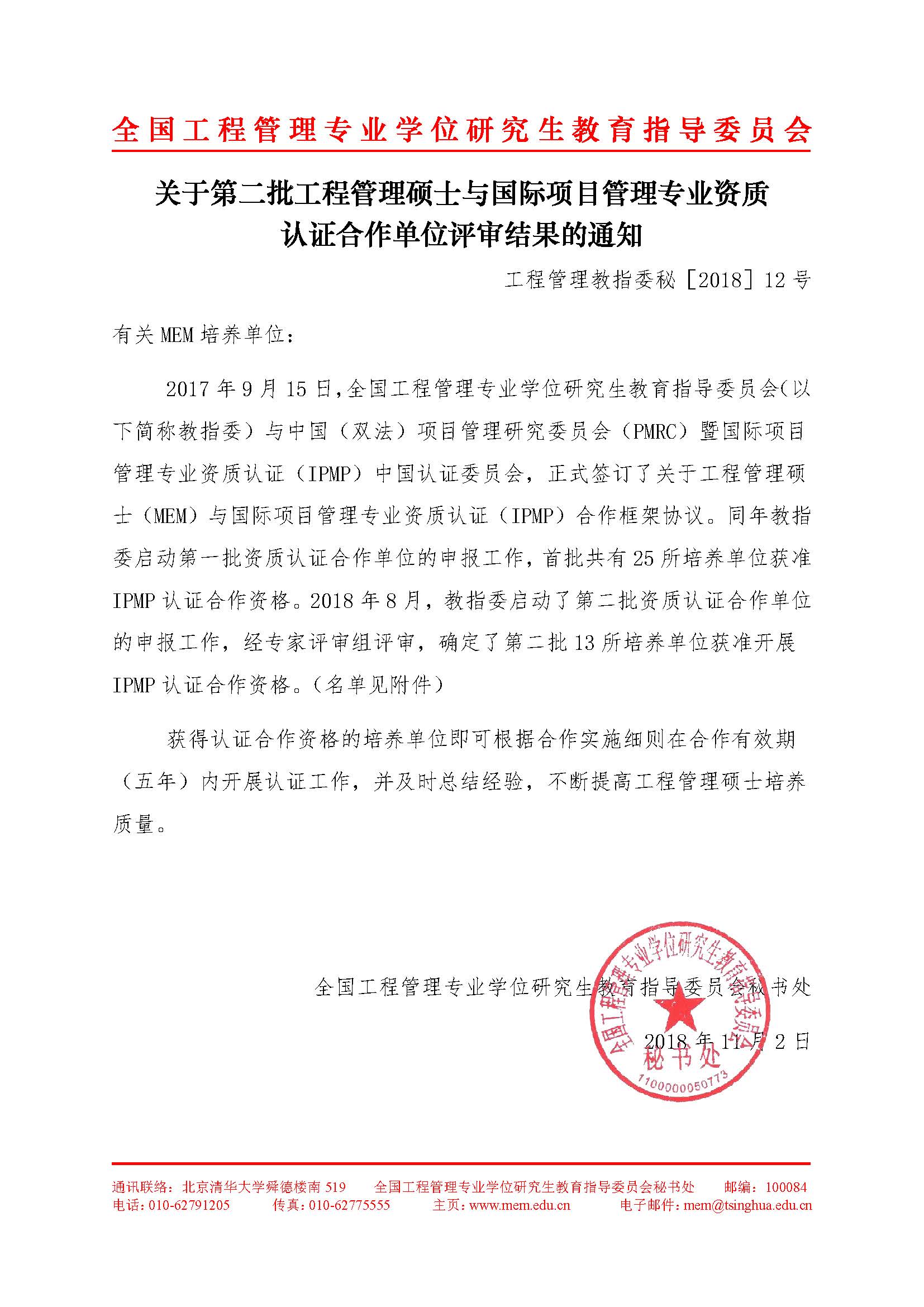 2018年10月,由我校土木与交通学院申请,经全国工程管理专业学位研究生教育指导委员会(以下简称教指委)、国际项目管理专业资质认证(IPMP)中国认证委员会项目管理领域资质认证评估专家委员会的评审,我校被批准成为工程管理硕士(MEM)与国际项目管理资质认证(IPMP)合作单位之一。