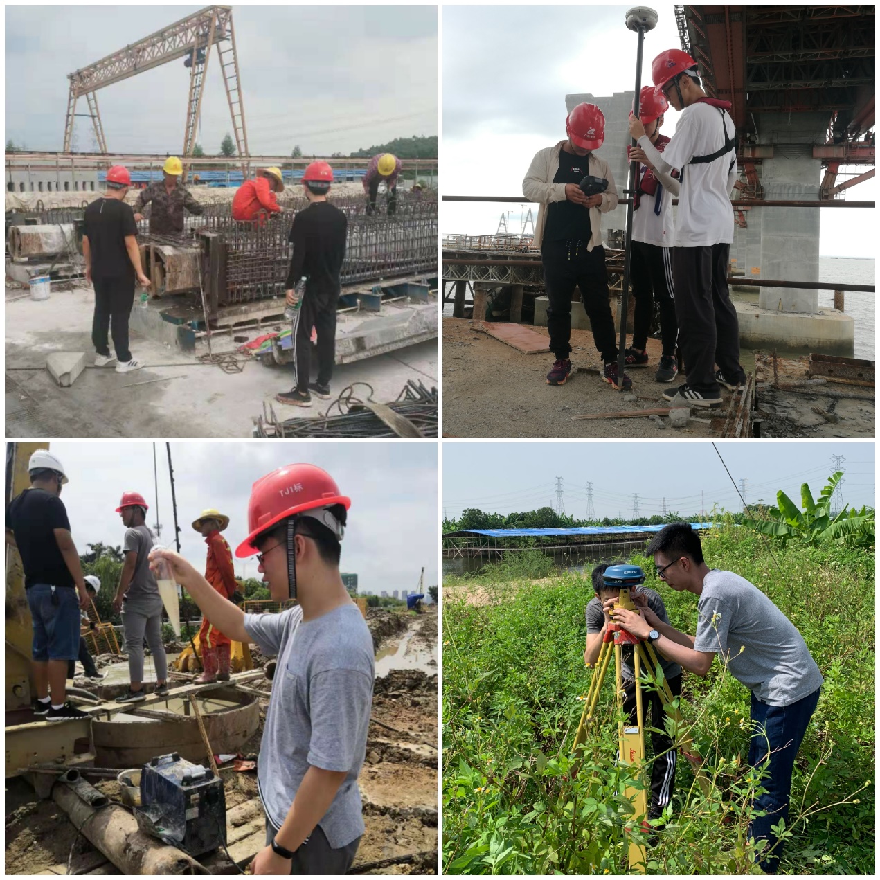 这是同学们第一次走进工地,来到施工一线学习路桥施工技术,心情很激动。东雷小组同学非常幸运地观摩学习了通明海跨海大桥现浇混凝土箱梁移动模架施工法的整个工艺流程。中山小组同学了解了桩基施工出现斜桩问题时的解决方法。开阳小组同学在现场协助工人师傅进行混凝土的浇筑工作,学习了混凝土养护技术。梅平小组同学进到抢险施工的人子石隧道中测量隧道沉降,熟悉了打入锚杆支护、喷射混凝土、控制地下渗水等技术。在施工现场学习的同时,同学们查阅了设计图纸和设计资料,学习BIM路桥施工管理新技术,不断深化专业知识,提高专业素养。