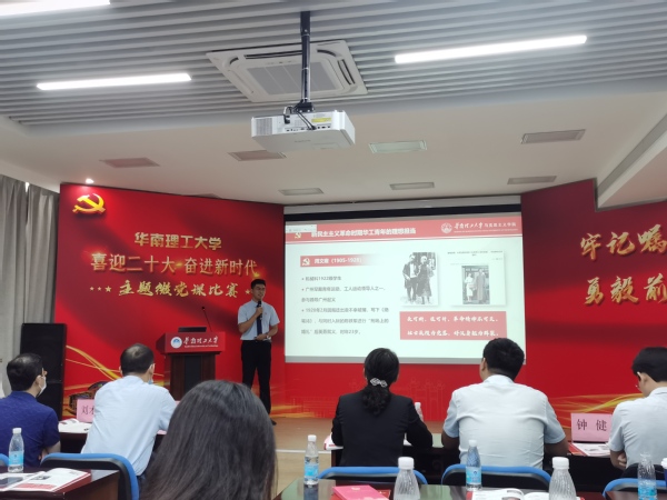 6月21日下午,华南理工大学“喜迎二十大 奋进新时代”微党课决赛在大学城校区B9南座301室举行。马克思主义学院党委选送的2021级学术型硕士生党支部微党课《将青春理想汇入时代洪流》获学生组一等奖。