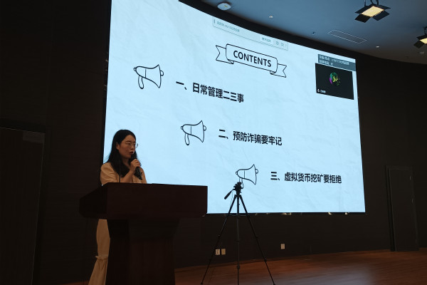 李至祎老师就日常管理、预防诈骗、虚拟货币挖矿等内容给同学们进行安全教育。关于外出原则,李老师再次强调“非必要不外出”,严格遵守疫情防控规定,并针对不同情况作了详细的请假流程说明。其次,她对一些电信网络诈骗类型进行了介绍,提醒同学们要时刻注意人身安全和财产安全,谨防诈骗。