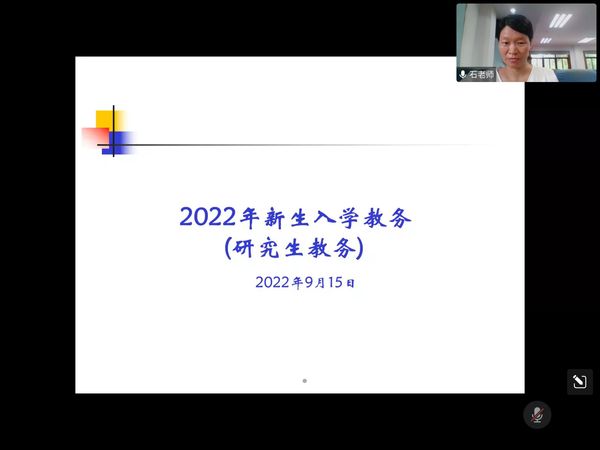 石金叶老师介绍了有关研究生教务方面各项事务的相关流程及规定,向同学们详细讲解了学籍管理、培养环节、学位论文工作的流程、培养计划提交、学籍表及学生证的填写、硕士生毕业及申请学位规定等方面的基本要求。她叮嘱同学们要严格按照教学要求完成相关的教学活动,并祝愿同学们愉快地度过硕士研究生期间的每一天。