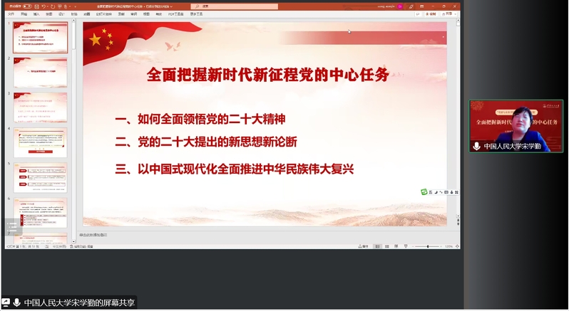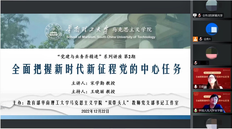 作为全国高校“双带头人”教师党支部书记工作室培育单位,华南理工大学马克思主义学院基础教研室党支部积极开展党建品牌化建设系列活动。12月22日下午,由基础教研室党支部(“双带头人”工作室)主办的“党建与业务齐精进”系列活动的第二场学习讲座顺利召开,教育部“长江学者”特聘教授、中国人民大学马克思主义学院副院长、教育部首批高校“双带头人”教师党支部书记工作室负责人宋学勤教授应邀作主题为“全面把握新时代新征程党的中心任务”的学术报告。报告会以线上形式举行,由基础教研室党支部书记王晓丽教授主持,华南理工大学马克思主义学院及广州理工学院的部分师生代表参会。