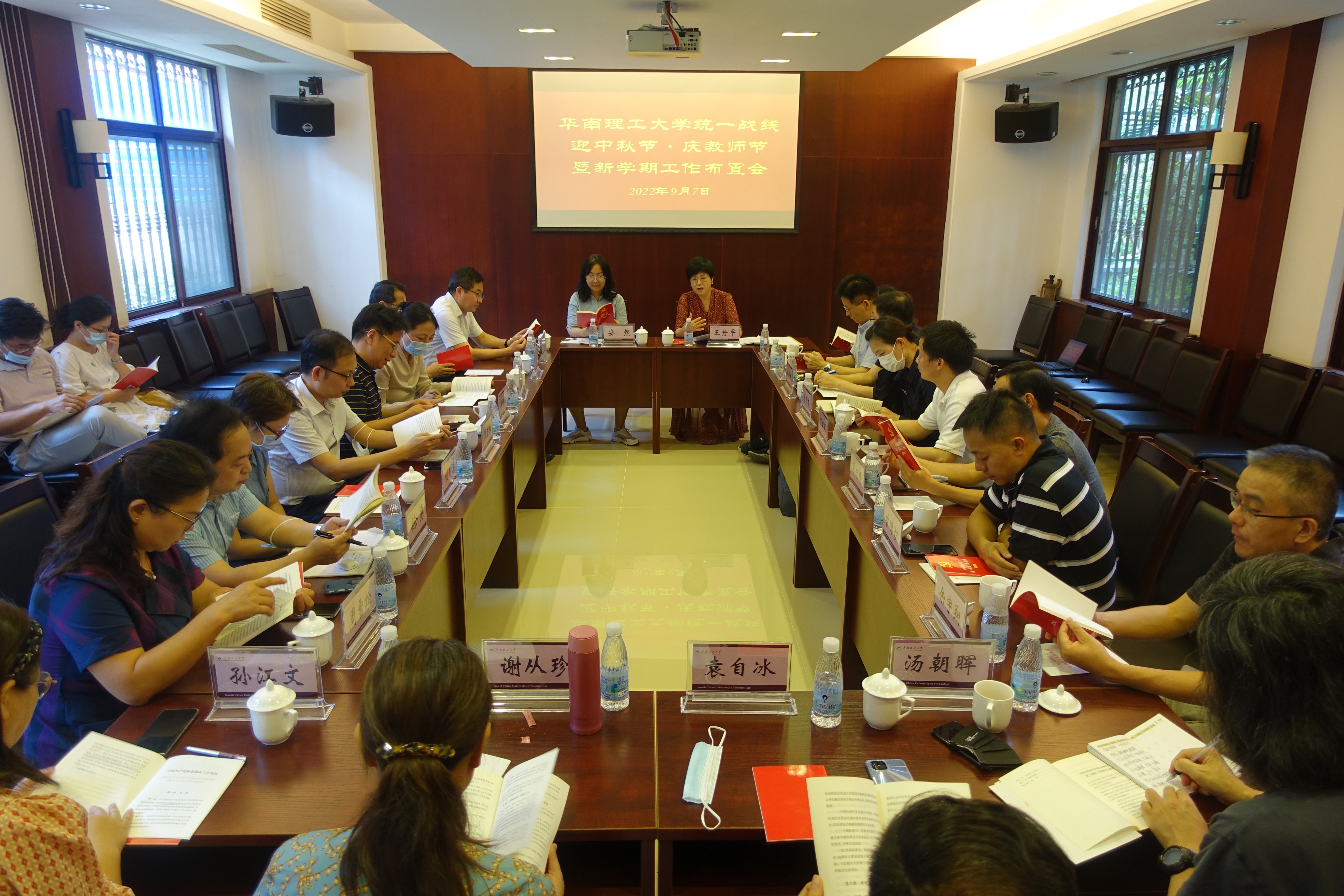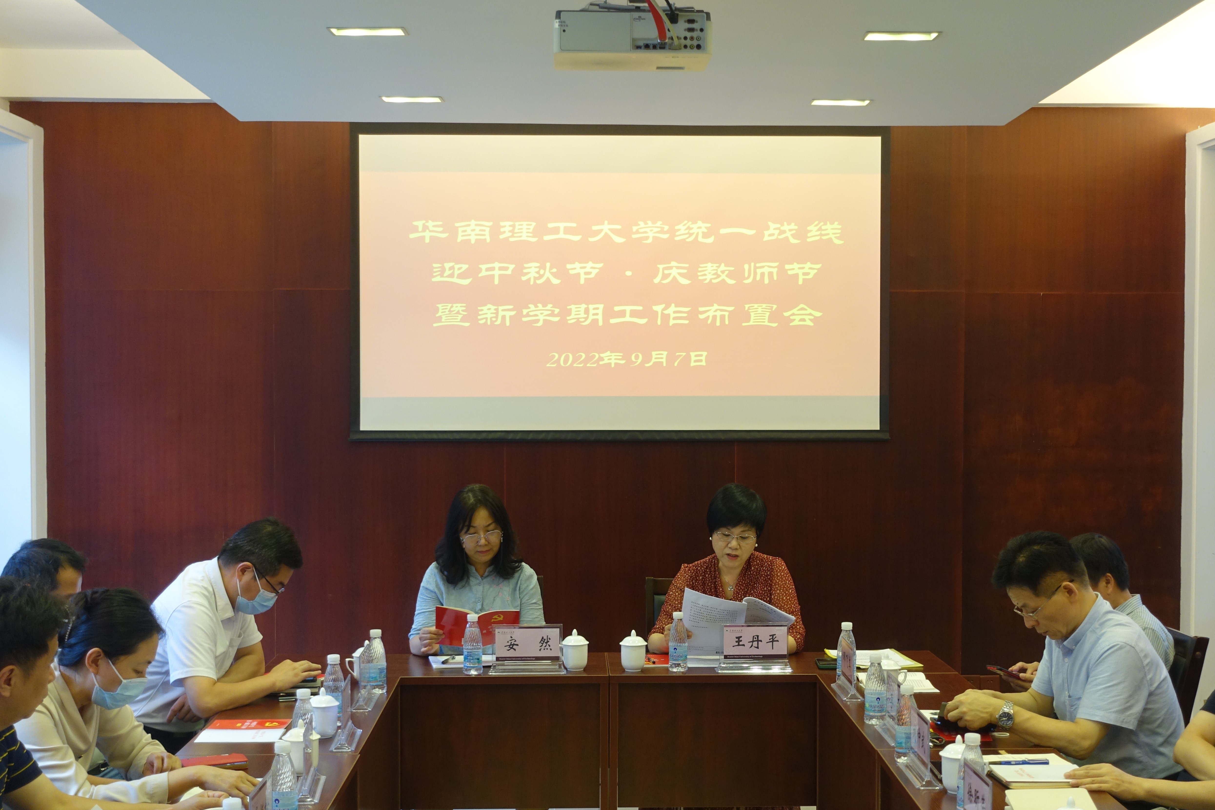 在教师节、中秋节来临之际,9月7日下午,华南理工大学统一战线在民主楼会议室召开了迎中秋节·庆教师节暨新学期工作布置会,共庆第38个教师节,喜迎二十大召开。学校各级人大代表、政协委员、政府参事,各民主党派、统战团体负责人参加座谈会,喜迎佳节,共叙“牢记使命、立德树人”情怀。党委常委、统战部部长王丹平主持会议。