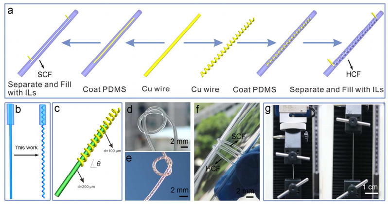 Transparent and Waterproof Ionic Liquids-Based Fibers for Highly Durable Multifunctional Sensors and Strain-Insensitive Stretchable ConductorsSong Chen, Haizhou Liu, Shuqi Liu, Pingping Wang, Songshan Zeng, Luyi Sun*, and Lan Liu* Abstract Ionic liquids (ILs) are regarded as ideal components in the next generation of strain sensors because their ultralow modulus can commendably circumvent or manage the mechanical mismatch in traditional strain sensors. In addition to strain sensors, stretchable conductors with strain-insensitive conductance are also indispensable in artificial systems for connecting and transporting electrons, similar to the function of blood vessels in the human body. In this work, two types of ILs-based conductive fibers were fabricated by developing hollow fibers with specific micro-scale channels which were then filled with ILs. Typically, the ILs-based fiber with straight micro-channels exhibited a high strain sensitivity and simultaneously rapid responses to strain, pressure, and temperature. The other ILs-based fiber with helical micro-channels exhibited good strain-isolate conductance under strain. Due to the high transparency of ILs along with the sealing process, the as-prepared ILs-based fibers are both highly transparent and waterproof. More importantly, owing to the low modulus of ILs and the core-shell structure, both of the conductive fiber prototypes demonstrated high durability (>10000 times) and long term stability (>four months). Ultimately, the ILs-based fibrous sensors were successfully woven into gloves flaunting the ability to detect human breathing patterns, sign language, hand gestures, and arm motions. The ILs-based strain-insensitive fibers were successfully applied in stretchable wires as well. Link:http://pubs.acs.org/doi/abs/10.1021/acsami.7b17790 |