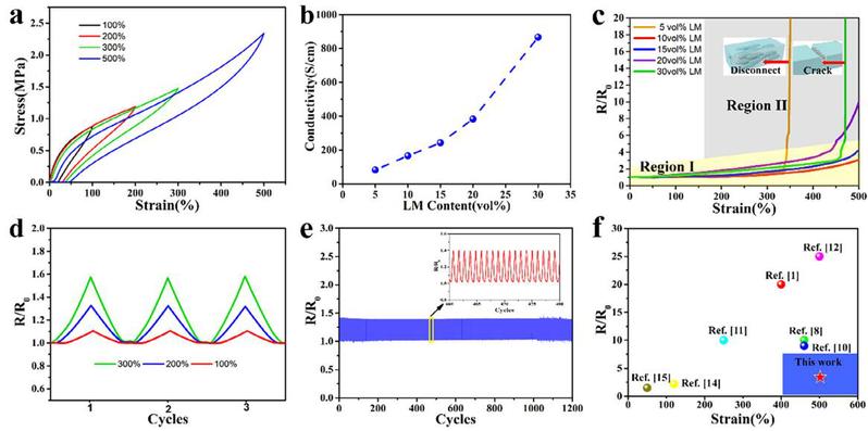 Advanced stretchable characteristic of liquid metal for fabricating extremely stable electronics Rongmin Zheng,Yunhui Wu, Yonghang Xu, Shuqi Liu, Pingping Wang, Zhifu Deng, Song Chen, Lan Liu* Abstract In this work, an advanced stretchable characteristic of liquid metal (LM) was revealed for fabricating a highly stretchable and extremely stable conductor. Thanks to the deformable advantage of LM droplets continuously connected in polyurethane (PU) matrix, the stretchable conductor with outstanding conductivity (165.5 S/cm) exhibits extreme stability that the resistance change is less than 300% even strain up to 500%. The stretchable conductor with advanced stretchable characteristic obviously surpasses the common conductors that utilize brittle conductive nanomaterials (i.e. graphene (GE), carbon nanotubes(CNT), silver (Ag) and copper (Cu)) and such advanced characteristic of LM makes it attractive in various stretchable electronic devices. 文章链接:https://doi.org/10.1016/j.matlet.2018.10.010 |