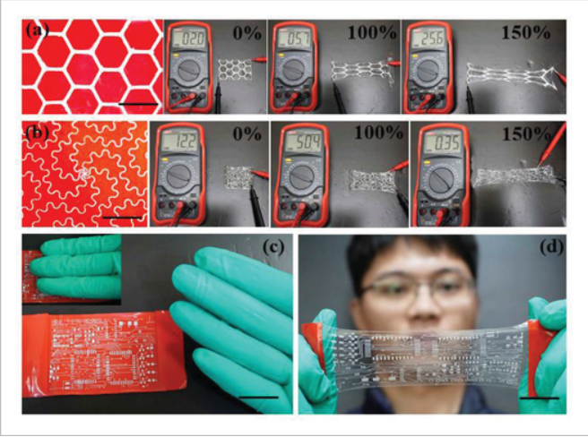 A Novel Strategy for Preparing Stretchable and Reliable Biphasic Liquid Metal Yun-hui Wu,Zhi-fu Deng,Ze-fei Peng,Rong-min Zheng,Shu-qi Liu, Shu-ting Xing,Jun-yun Li,De-qun Huang,Lan Liu* Abstract Low-melting liquid metal is a hugely promising material for flexible conductive patterns due to its excellent conductivity and supercompliance, especially low-cost and environmental liquid processing technology. However, the ever-present fluidity characteristic greatly limits the stable shape and reliability of prepared liquid metal conductive electronics. Herein, a novel solidification strategy of liquid GaIn alloys by Ni doping and heat treatment is first reported, which can efficiently create a solid phase in the liquid metal and provide an effective solution for practical applications. Particularly, the liquid characteristic is preserved for conveniently fabricating different flexible electronic circuits, and then the solidification is carried out on prepared conductive patterns by heat treatment. The solidification mechanism is revealed by the interface chemical reaction between Ni and GaIn, creating the solid phase of intermetallic compound (Ga4Ni3 and InNi3) during heat treatment. Moreover, a biphasic GaInNi can be obtained by regulating the atomic ratio of gallium, indium, and nickel. As a result, the obtained GaInNi possesses extremely low sheet resistance (15 ± 4.5 to 135 ± 2.5 mΩ sq−1 ) and the variation of ΔR/R0 exhibits low level (0–2) when strained up to 100%, which offers a promising strategy to prepare stretchable and reliable liquid metal electronics. 文章链接: http://doi.org/10.1002/adfm.201903840 |
