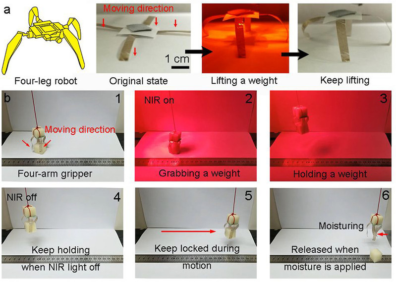 A Biomimetic Interface with High Adhesion, Tailorable Modulus for On-Skin Sensors, and Low-Power Actuators Song Chen,Songshan Zeng,Shuqi Liu,Haizhou Liu,Rongmin Zheng,Kevin L. White,Andrew T. Smith,Lan Liu*,and Luyi Sun* Abstract Recently, stimuli-responsive sensors and actuators have drawn significant attention as they are promising in a wide scope of applications, including wearable devices and soft robotics. However, they both face serious challenges in terms of interface management, that is, the weak sensor–skin interfacial interaction and the single binding function in actuators. Herein, we design an adhesive and modulus tailorable interface by in situ polymerization of dopamine (DA) along the poly(vinyl alcohol) (PVA) macromolecular chains and the incorporation of ionic coordination between polymer molecular chains (PVA and polydopamine (PDA) chains) and metal ions (Fe3+). Note that the introduction of hygroscopic Fe3+ cations not only facilitates the coordination to increase the water tolerance of the interface but also improves the water uptake into the system, which is essential for tailoring both the adhesion and modulus of the interface. By adopting this interface, we successfully fabricate a soft (skin-like modulus 0.1–10.0 MPa), ultrathin (∼50 μm), self-adhesive, and skin-compliant sensor. Furthermore, the interface is also applied to bind two active layers to fabricate a multiresponsive (heat, near-infrared (NIR) light, voltage, and humidity) actuator. In addition to the adhesion function, the interface can also help lock the actuator states thanks to the tunable modulus of the interface, which is highly valuable for decreasing the power consumption of the actuator. This work provides a new avenue to address both sensing and actuating bottlenecks by focusing on the interface. 文章链接: https://pubs.acs.org/doi/full/10.1021/acs.chemmater.9b02274 |