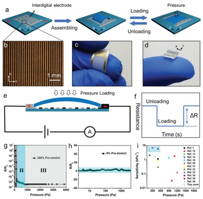 A multidimensional hierarchical structure designed for lateral strain-isolated ultrasensitive pressure sensing Junyun Li, Song Chen, Zefei Peng, Zhifu Deng, Shuting Xing, Yaoyi Wu, Shuqi Liu and Lan Liu* Abstract Most of the as-reported piezoresistive sensors are difficult to use under dynamic deformation (e.g., bending, twisting, and buckling) since their pressure sensitivities vary significantly as a result of the lateral strain induced by dynamic deformation. Herein, taking advantage of the “modulus mismatch” and “Poisson effect”, a brand new multidimensional hierarchical structure (i.e., a wrinkle structure arranged in the pre-stretching direction and arch structure perpendicular to the pre-stretching direction) is designed and introduced in strain-isolated ultrasensitive piezoresistive sensing. The obtained pressure sensitivity is as high as 4.54 kPa−1 under small pressures (0–200 Pa) and remains constant under variable lateral strains (0–150%). The aim of this novel structure is to realize accurate pressure measurements under dynamic deformation and superior properties in conjunction with a low detection limit, fast response, and high stability, making our piezoresistive sensors promising in various practical and clinical applications, such as real-time health monitoring and wearable sensing devices. 文章链接 https://doi.org/10.1039/C9TC06213K |