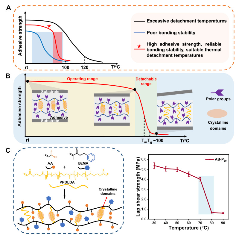 Thermoreversible adhesives with preciselytemperature-controlled detachment enabled by temperature-responsive crystallinedomainsWenwei Yang, Yubing Fu, SiyuGan, Xueling Yan, Liwei Lu, Xinyu Chen, Lan Liu* Abstract Thermoreversible adhesives allow for on-demand bondingand debonding on diverse surfaces through thermal stimulation. They have greatpotential in applications such as temporary fixation, which helps lower productcosts and meet the requirements for environmental protection. However, theexisting thermoreversible adhesive materials face challenges such as imprecisethermal switching, excessively high detachment temperatures, or poor bondingstability. To address these issues, here, we innovatively introduce temperature-responsivecrystalline domains with an appropriate melting temperature (Tm) into theadhesive. These crystalline domains stabilize the adhesive network, therebyenabling it to maintain the high lap shear strength of the adhesive across awide range. However, above Tm, close to the glass transition temperature (Tg)of the amorphous domains, it causes rapid softening and bonding failure.Therefore, the prepared thermoreversible adhesive simultaneously achieves highlap shear strength (5.38 MPa), reliable bonding stability over the normaloperating temperature range (>75% of initial value, 30–70 °C), suitablethermal detachment temperature (∼80°C, 0.66 MPa), and high environmental reliability. This work provides afeasible strategy for designing precision thermoreversible adhesives, which isconducive to promoting the application of thermoreversible adhesives inscenarios such as temporary fixation.
