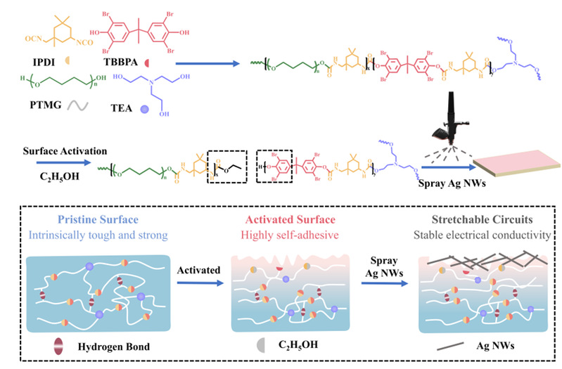 Surface-Activated Phenol-Urethane ElastomerEnablingTough, Adhesive, and Conductive Interfacesfor Stretchable Hybrid ElectronicsShuqi Chen, Zelin Liu,Liwei Lu, Xueling Yan, Siyu Gan, Lan Liu* Abstract Interfacialmismatch between soft substrates and rigid components fundamentally limits thereliability of stretchable hybrid electronics (SHEs), especially whenattempting to simultaneously achieve high bulk strength and strong interfacialadhesion. Here, we introduce a surface activation strategy based on dynamicphenol-urethane bond exchange to enable self-adhesive and conductivestretchable conductors, allowing rigid electronic devices to be directlyattached to the substrate in a plug-and-play manner. A dynamic bisphenol polyurethaneelastomer (BPU) was designed to unify high intrinsic strength with tunabledynamic activity by programming phenol-urethane bonds, resulting in broadlytunable mechanical properties, with tensile strength ranging from 15 to50 MPa and elongation from 395% to 757%. After 45 min ofethanol-vapor activation, the BPU surface achieved a peeling strength of 10.5N/cm while maintaining high mechanical strength (26.6 MPa). Asemi-embedded conductive network was constructed by thermally induced reorganizationof Ag nanowires (Ag NWs), yielding stretchable conductors with low sheetresistance (11 Ω/sq), strong adhesion (7.75 N/cm), and high stretchability(≈270%). The prepared SHEs sustain up to 250% strain and retain stableconductivity after 4000 cycles under 30% strain, demonstrating theeffectiveness of surface activation in strengthening soft/hard interfaces.