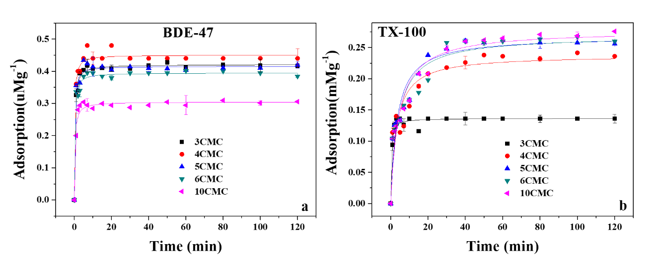 图2 不同浓度的TX-100溶液中BDE-47和TX-100在5%Ag/TiO2上的吸附动力学