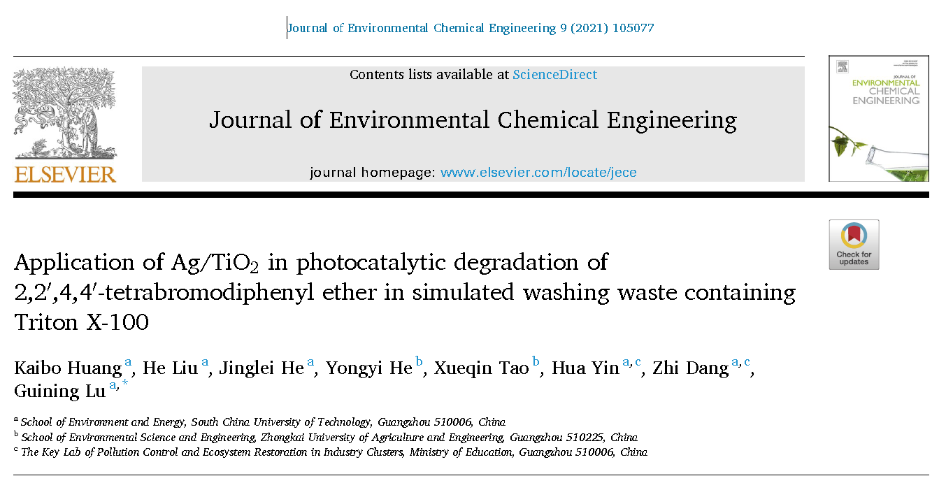 论文以“Application of Ag/TiO2 in photocatalytic degradation of 2,2′,4,4′-tetrabromodiphenyl ether in simulated washing waste containing Triton X-100.”为题在线发表于环境领域学术期刊Journal of Environmental Chemical Engineering上(https://doi.org/10.1016/j.jece.2021.105077.),博士生黄开波同学主力贡献,是其个人第5篇一作论文。欢迎感兴趣的同行关注。