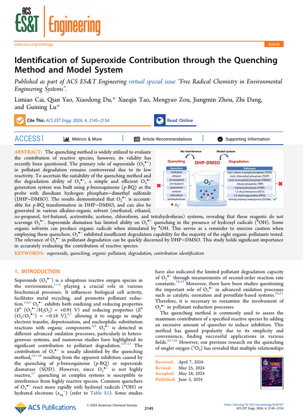 【摘要】The quenching method is widely utilized to evaluate the contribution of reactive species; however, its validity has recently been questioned. The primary role of superoxide (O2•–) in pollutant degradation remains controversial due to its low reactivity. To ascertain the suitability of the quenching method and the degradation ability of O2•–, a simple and efficient O2•– generation system was built using p-benzoquinone (p-BQ) as the probe with disodium hydrogen phosphate–dimethyl sulfoxide (DHP–DMSO). The results demonstrated that O2•– is accountable for p-BQ transformation in DHP–DMSO, and can also be generated in various alkaline-organic solvent (methanol, ethanol, iso-propanol, tert-butanol, acetonitrile, acetone, chloroform, and tetrahydrofuran) systems, revealing that these reagents do not scavenge O2•–. Superoxide dismutase has limited ability on O2•– quenching in the presence of hydroxyl radicals (•OH). Some organic solvents can produce organic radicals when stimulated by •OH. This serves as a reminder to exercise caution when employing these quenchers. O2•– exhibited insufficient degradation capability for the majority of the eight organic pollutants tested. The relevance of O2•– in pollutant degradation can be quickly discerned by DHP–DMSO. This study holds significant importance in accurately evaluating the contribution of reactive species.