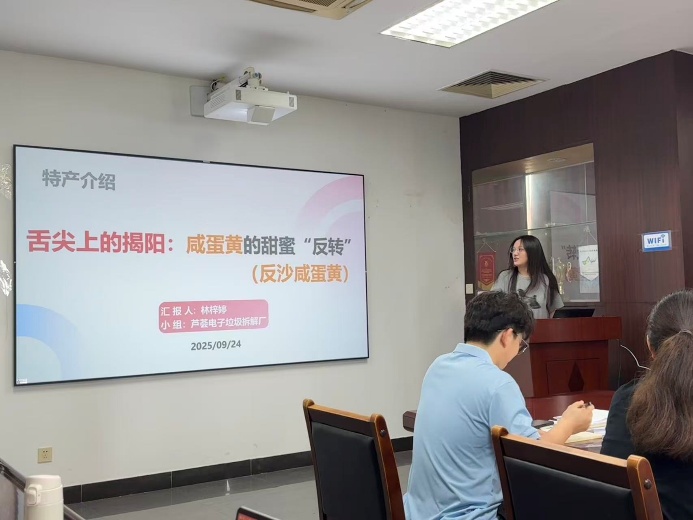会议首项议程为特产介绍环节。林梓婷同学首先介绍了其家乡揭阳特色传统文化,随后展示了特色美食“反沙”咸蛋黄,并为大家解读了其中蕴含的奇妙味觉反转的奥秘。