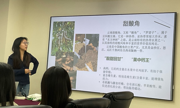 在第一个环节,陈卓妍同学介绍了自己的家乡云南,介绍了当地的气候和水果,并带来了特产美食甜酸角等给大家品鉴,味道酸甜可口。
