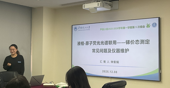 最后来到会议的第三个环节,本次专题汇报由钟紫娟同学带来“液相-原子荧光光谱联用——锑价态测定的常见问题及仪器维护”,她主要对锑价态检测中采用液相色谱和原子荧光光谱联用方法的优势、注意事项以及检测过程中可能遇到的问题和仪器的维护等方面进行介绍,为大家的后续实验提供了技术参考。