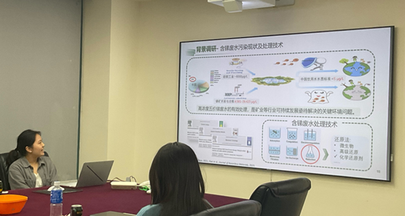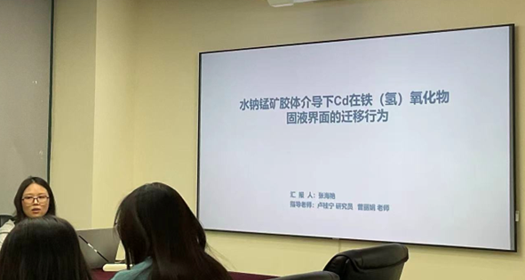 随后会议进入到第二个环节常规汇报。首先是来自“矿区淘金大队”的张海艳同学,她汇报了近期的实验进展,介绍了水钠锰矿胶体、针铁矿和赤铁矿对镉的吸附行为,引发了在场师生的热烈讨论。