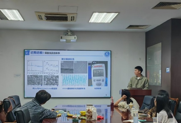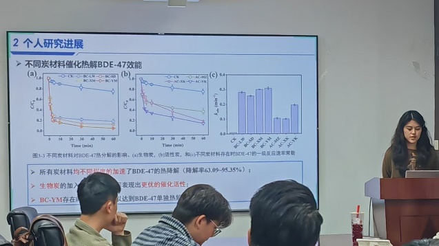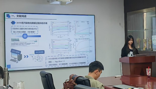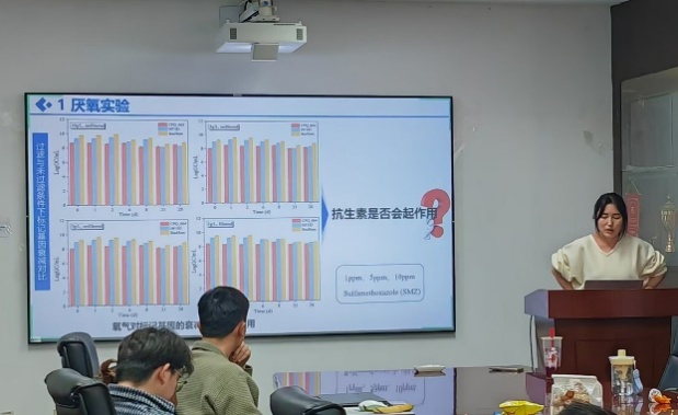 随后进入常规学术汇报环节,五位同学依次汇报近期工作与思考。活力无限小组的郑雄开率先汇报。他结合最新实验数据,初步提出溶解性有机质与S²⁻可能存在相互作用的假设,引起在场师生的浓厚兴趣,大家就实验数据与验证思路展开讨论。芦荟电子垃圾拆解厂的温美会随后介绍组内工作,并重点汇报大论文关于炭材料对多溴联苯醚低温热分解性能的影响的逻辑框架,芦荟们对此提出了很多建设性意见。矿区淘金大队的黄旗总结小组成员近期成果,同时梳理个人工作进展,条理清晰,获得一致肯定。芦荟追新学院的刘诗娴分享文献阅读收获,系统介绍DOM在污染物光降解中的作用机制,师兄师姐就研究切入点给出建议。最后,所油联队的徐曼馨汇报组内进展,并详细说明近期厌氧实验结果与后续计划,已完成的论文插图规范美观,得到师生认可。