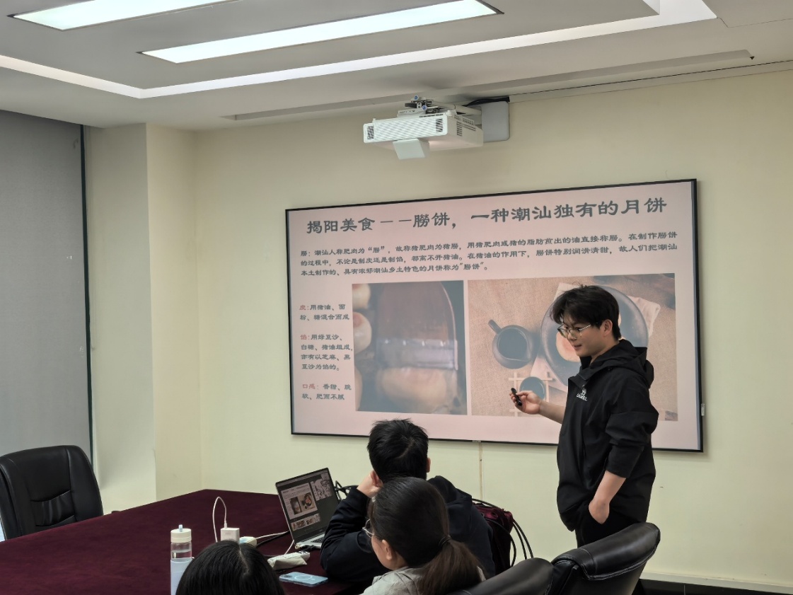 会议伊始,郑雄开同学以“走进揭阳”为主题,带领大家“云游”广东揭阳,从地域文化到饮食风情,细腻勾勒出家乡的轮廓。他带来的传统特产——朥饼,以酥脆的外皮与香甜的内馅赢得了全场好评,现场气氛顿时活跃起来。