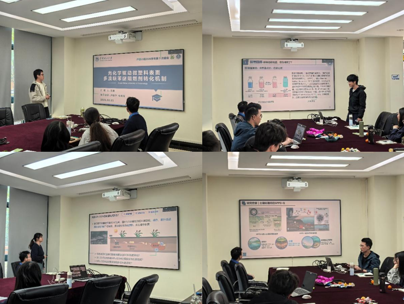 会议进入到第二个环节——常规汇报。第一个出场的是代表所油联队的王庆同学,她主要汇报了近期的实验进展,重点针对实验数据图进行分析,并提出了自己的疑惑,掀起了首轮讨论高潮。其次,电子垃圾拆解厂的王逊同学聚焦“光化学驱动微塑料表面多溴联苯醚阻燃剂转化机制”这一课题,从背景到数据,层层深入,其在数据处理中遇到的问题引发了新一轮的激烈思辨。随后,来自矿区淘金大队的叶嘉铭同学对前期实验结果进行了复盘,并结合文献调研提出了自己的初步想法。紧接着,来自活力无限小组的刘哲同学从研究内容和实验方法入手,汇报了地膜微塑料溶解性有机质对土壤重金属形态的影响的研究进展,并展示了近期的数据结果。最后,陈锦帆同学代表芦荟追新学院进行汇报,他对前期实验的遗留问题进行小结,系统介绍了实验体系搭建、近期成果,并详细规划了后续工作。