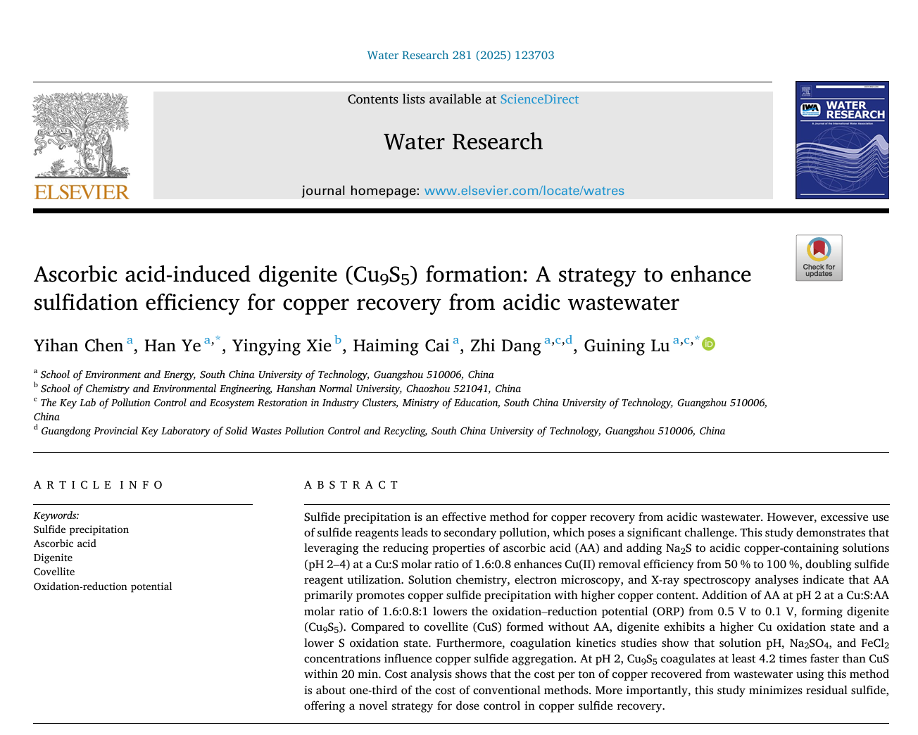 【标题】Ascorbic acid-induced digenite (Cu9S5) formation: A strategy to enhance sulfidation efficiency for copper recovery from acidic wastewater