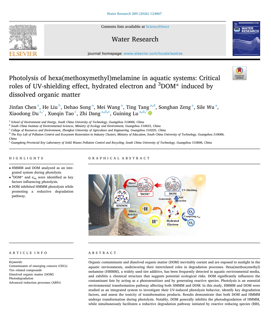 【摘要】Organic contaminants and dissolved organic matter (DOM) inevitably coexist and are exposed to sunlight in the aquatic environments, underscoring their interrelated roles in degradation processes. Hexa(methoxymethyl)melamine (HMMM), a widely used tire additive, has been frequently detected in aquatic environmental media, and exhibits a chemical structure that suggests potential ecological risks. DOM significantly influences the contaminant fate by acting as a photosensitizer and by generating reactive species. Photolysis is an essential environmental transformation pathway affecting both HMMM and DOM. In this study, HMMM and DOM were studied as an integrated system to investigate their UV-induced photolysis behavior, identify key degradation factors, and assess the toxicity of transformation products. Results demonstrate that both DOM and HMMM undergo transformation during photolysis. Notably, DOM generally inhibits the photodegradation of HMMM, while simultaneously facilitates a reductive degradation pathway initiated by reactive reducing species (RRS, including 3DOM* and eaq−). Our findings comprehensively provide evidence for RRS generation, supported by direct detection via electron capture signals and indirect indicators such as photolysis kinetics within HMMM-DOM system. These results refine the current understanding of photolysis pathways for tire-related contaminants in aquatic environments and emphasize the importance of evaluating contaminants and DOM as an integrated system in environmental photochemistry.