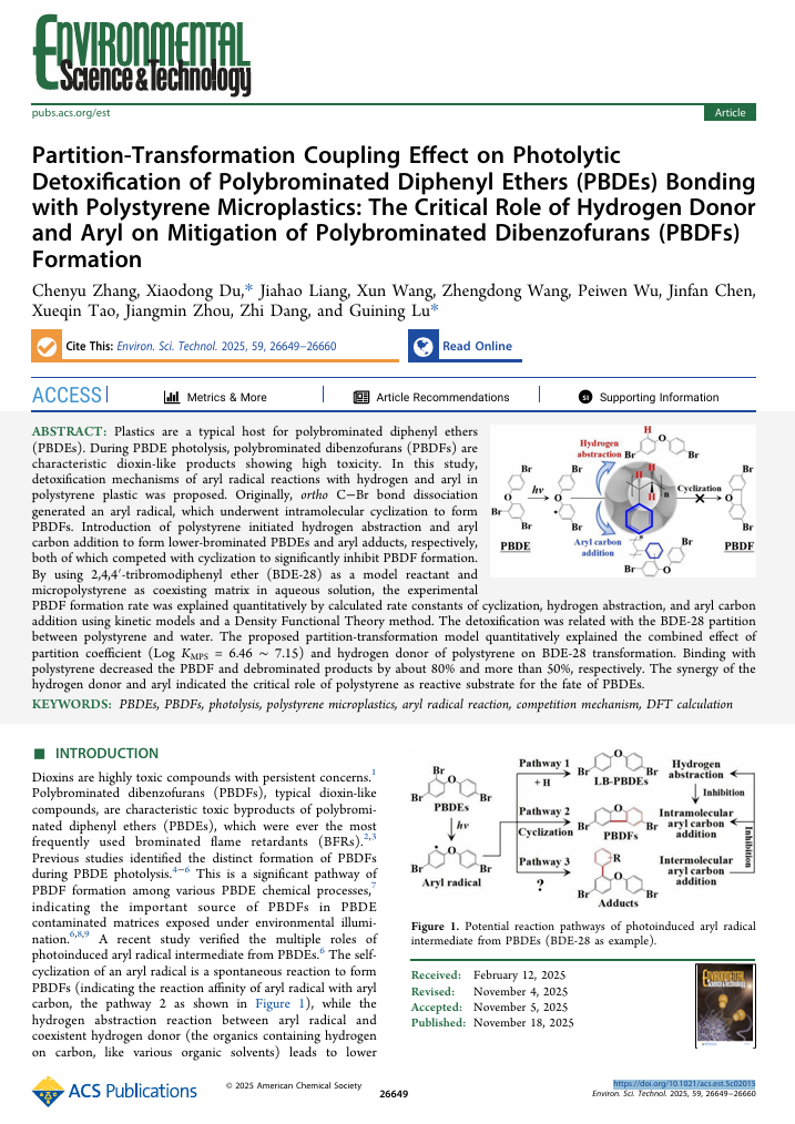 【标题】Partition-Transformation Coupling Effect on Photolytic Detoxification of Polybrominated Diphenyl Ethers (PBDEs) Bonding with Polystyrene Microplastics: The Critical Role of Hydrogen Donor and Aryl on Mitigation of Polybrominated Dibenzofurans (PBDFs) Formation