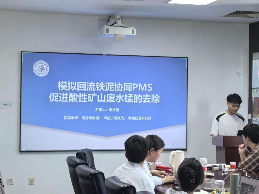 常规汇报环节,首先是夏迪同学代表“所油联队”进行汇报,汇报完组内成员近期实验工作后,其个人以“基于可疑筛查与非靶向分析的金属制品场地地下水中新污染物筛查”为题对近期数据整理做了详细讨论与分析,针对相应的分析方法也引起了大家的兴趣与探讨;随后是“活力无限”小组的符其娴同学进行汇报,她首先对大论文中的剖面土壤数据进行了汇报,并分享了小论文投稿过程中的遇到的问题及解决方法经验;紧接着是“矿区淘金大队”的李永誉同学进行有关于“模拟回流铁泥协同PMS促进酸性矿山废水锰的去除”的汇报,大家对其机理探讨的实验设计上进行充分讨论,并提出可能的实验方案;“芦荟电子垃圾拆解厂”的温景弘同学在简单介绍了组员的进展后,对DOM介导下多溴联苯醚光化学分配-转化实验结果进行了汇报,汇报过程中大家对某些结果上的分析存疑,并提出需要进一步去整合数据加强分析;最后是来自“追新学院”的江漫同学,深入分析了壳聚糖水凝胶固定脂肪酶降解土壤中PAEs的研究,包括材料固定化、降解动力学和盆栽实验等内容,与其他准毕业生一样他目前也面临着繁重的大论文写作任务,在场老师们也借此机会提醒在校生们,要合理安排时间,借鉴师兄师姐的经验教训,提前规划好各个时间节点,遇到困难及时沟通,确保毕业进程平稳顺利。
