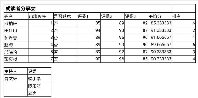 规则说明:于3月19日举行朗读者分享会,参加同学做朗读分享,由三位评委根据朗读表现打分,评选出前三名给予奖励。