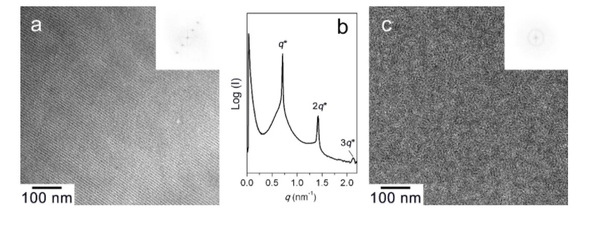 图1. DPOSS-PS本体自组装的TEM图 (a) 和一维SAXS曲线(b)。甲苯溶液旋涂得到的DPOSS-PS在120 °C退火15分钟后的TEM图。