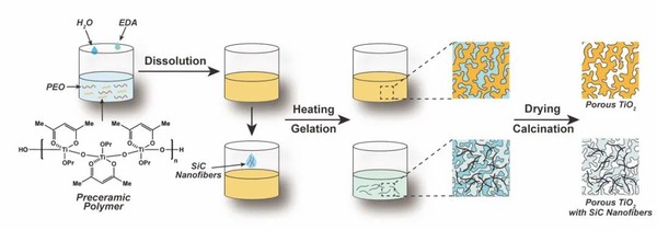 作者采用了聚合物陶瓷前驱体为起始原料,和小分子陶瓷前驱体相比,聚合物陶瓷前驱体具有更温和的反应活性和更高的陶瓷转化率。为了增强多孔TiO2材料,在陶瓷前驱体聚合物溶液体系中加入了SiC纳米纤维,并使用了聚氧乙烯(PEO)和乙二胺(EDA)分别促进相分离和溶胶-凝胶过程,通过调节PEO和EDA的含量灵活调整多孔TiO2整体柱材料的微观形貌(图1)。