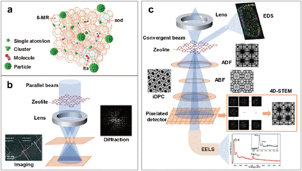 图1.(a) 沸石分子筛中客体物种的类型及其空间分布示意图;(b–c)基于透射电子显微术的多种成像模式和表征方法示意图:(b)TEM 模式;(c)STEM 模式。