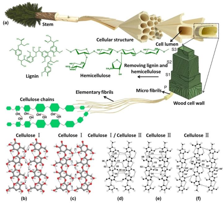 Figure 3. a) Graphical illustration of hierarchical structure of wood, from macroscopic to molecular scale. b,c) Schematics of suggested hydrogen bonding system of cellulose I and cellulose II, (110)t plane (b) and (200)m (c) in cellulose I, in which the cellulose chains are linked together by intermolecular hydrogen bonds at O(2)H-O(6). b,c) Reproduced with permission.