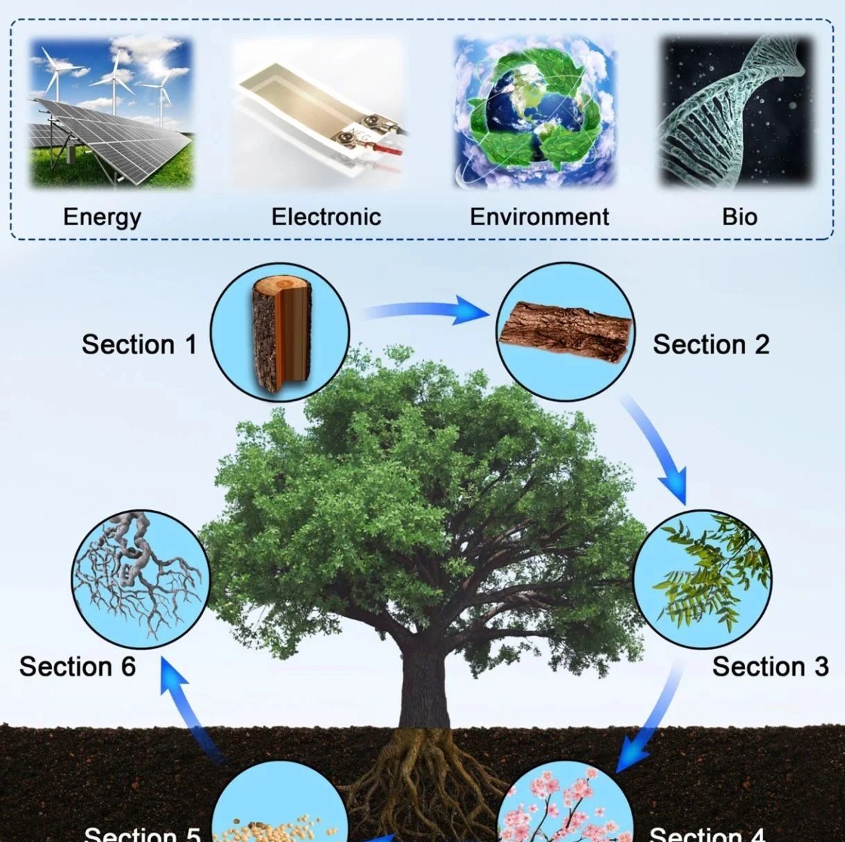 Figure. Schematic illustration of the main sections in this review, including materials and structures derived from the trees (trunk, bark, leaf, flower,seed, and root) for the applications in energy, electronic, environmental, and biological fields.