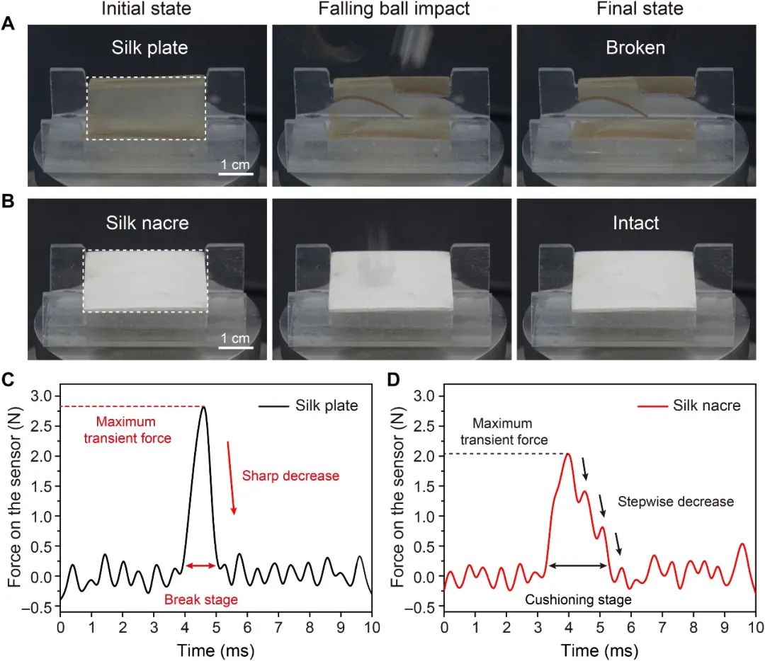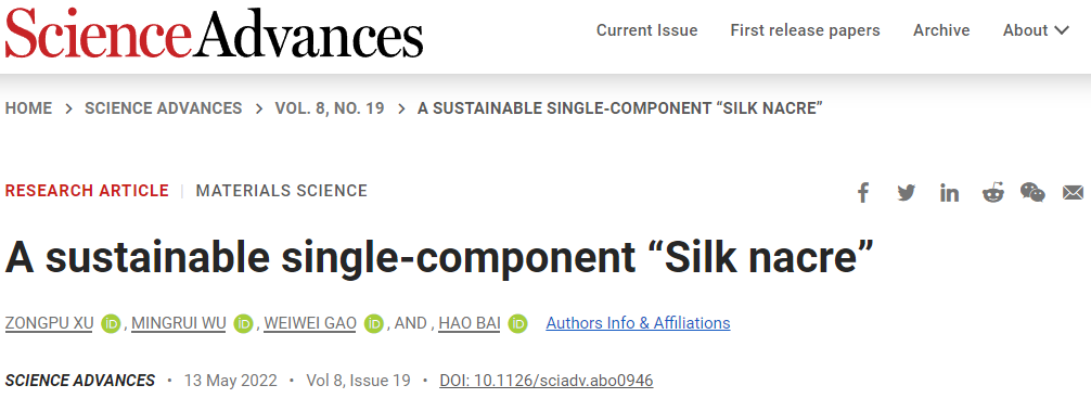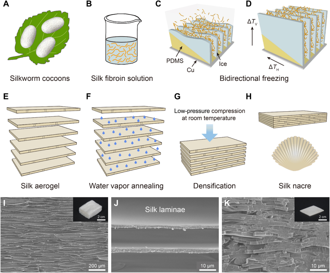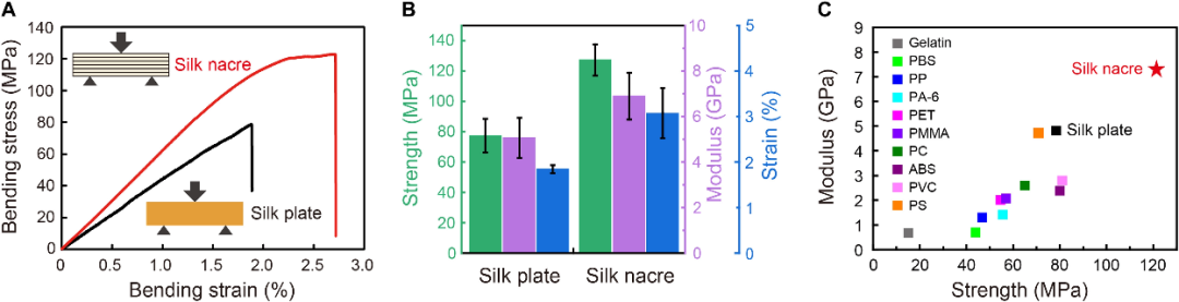 受蚕丝和竹子等生物基“单组分”复合材料的自然例子启发,浙江大学柏浩教授团队报告了一种单组分蚕丝蛋白仿珍珠母材料,其中珍珠层的典型“砖-泥”结构仅用蚕丝蛋白构成,并通过结合双向冷冻、水蒸气退火和致密化的简便程序进行制备。与直接浇筑而成的蚕丝蛋白块状材料比,其弯曲强度、模量和应变分别提高了67%、37%和19%。同时,蚕丝蛋白仿珍珠母材料还具备可控的可塑性。此外,丝绸珍珠层在37℃条件下可被链霉蛋白酶E完全降解,表明其良好的环境友好性。相关工作以“A sustainable single-component “Silk nacre””发表在《Science Advances》。蚕丝蛋白仿珍珠母材料是通过双向冷冻、水蒸气退火和致密化构建的。首先,从蚕茧中提取丝素蛋白溶液,然后通过双向冷冻技术获得了具有长程排列层状结构的蚕丝蛋白气凝胶。然后将冻干的气凝胶置于 75%相对湿度和室温下进行水蒸气退火。在这个过程中,水分子穿透了气凝胶并塑化了薄片表面,从而提高了丝素蛋白链网络的流动性。最后,将经过水蒸气退火的蚕丝气凝胶垂直压缩以致密化,并通过丝层本身之间的粘附来制造蚕丝蛋白仿珍珠母材料。简而言之,研究者通过简单的制造程序成功地构建了具有珍珠层状复合结构的单组分材料。图1 蚕丝蛋白仿珍珠母材料的制备工艺和形态示意图。仿生材料的层次结构在其无与伦比的机械性能方面发挥着主导作用。尽管密度都约为1.3 g/cm-3且具有相同的成分,但蚕丝蛋白仿珍珠母材料和浇灌而成的蚕丝蛋白块状材料表现出显着不同的机械性能。三点弯曲试验的应力-应变曲线表明,蚕丝蛋白仿珍珠母材料可以承受更高的强度和更大的应变。值得注意的是,这种珍珠层状结构同时达到了强化和增韧的效果。结果表明蚕丝蛋白仿珍珠母材料的弯曲强度、模量和应变分别增加到125 MPa、6.8 GPa和3%,分别是块状材料的1.67、1.37和1.19倍。此外,其强度和模量超过了许多常用的聚合物,这表明它在机械性能方面作为合成聚合物的替代品具有相当大的潜力。一般来说,蚕丝蛋白材料的力学性能与其蛋白分子的构象有关,以往的研究已经证实,增加结晶度可以提高丝基材料的断裂强度。然而,根据傅里叶变换红外 (FTIR)光谱分析,蚕丝蛋白仿珍珠母材料中β-折叠的含量远低于浇筑而成的蚕丝蛋白块状材料(17%对36%),表明仿生结构导致了超出组件固有特性的,更好的机械结果。观察蚕丝蛋白块状材料和蚕丝蛋白仿珍珠母材料的断裂面,表明它们完全不同的断裂机制。作为均质材料,块状材料表现出脆性破坏,并观察到许多裂纹,导致其快速断裂过程。而对于仿珍珠母材料,一方面,“砖”和“泥”之间的致密界面增加了其断裂强度;另一方面,细长的蚕丝层状结构有效地延缓了断裂过程。图3 蚕丝蛋白块状材料和蚕丝蛋白仿珍珠母材料蛋白质构象和断裂形态的比较。研究者还通过落球冲击测试研究了蚕丝蛋白仿珍珠母材料中和蚕丝蛋白块状材料的抗冲击性。结果显示,块状材料在落球撞击后碎裂,而仿珍珠母材料保持完好,说明其抗冲击性较好。通过进一步分析发现,对于蚕丝蛋白块状材料,冲击时产生的最大瞬时力约为2.8 N,而后突然下降。相比之下,仿珍珠母材料的峰值约为2 N,并且逐步减小,这表明层状结构赋予了其显着的缓冲效果和抗冲击性。图4 蚕丝蛋白块状材料和蚕丝蛋白仿珍珠母材料的抗冲击性比较。尽管强度和刚度很高,但蚕丝蛋白仿珍珠母材料能够通过非常简单的方法制成各种形状。蒸汽可以破坏丝绸珍珠层内部的氢键并使其柔软,然后变得足够柔韧,可以加工成波浪形、弯曲形和螺旋形;在空气中冷却几分钟后,材料形状被固定。加工后的仿珍珠母材料可以承受自身重量的约1000倍的砝码。此外,由于丝素蛋白的内在性质,仿珍珠母材料显示出完全的生物降解性,其可以在37℃下,30天内完全生物降解。总结:研究者提出一种仿生策略来构建具有单一聚合物成分的高性能和可持续利用的复合材料。尽管其成分简单(纯蚕丝蛋白),蚕丝蛋白仿珍珠母材料通过模仿珍珠层的“泥-结”结构实现了出色的机械性能。连同其可控的可塑性和完全的生物降解性,该材料可以部分替代越来越难以回收和不完全降解的传统复合材料。