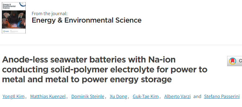 Yongil Kim, et al, Anode-less seawater batteries with Na-ion conducting solid-polymer electrolyte for power to metal and metal to power energy storage, Energy Environ. Sci., 2022