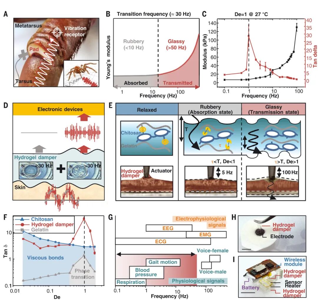 先进的生物电子学,如可穿戴和植入式设备,被认为是对人体生理信号进行连续检测和测量的非常有前景的技术。尽管最近在软材料和柔性材料与超薄电子器件的集成方面取得的成就实现了连续监测和多功能(多模式传感和刺激),但此类应用(例如,在患者护理中)通常受到动态噪声(通常低于30 Hz)产生的信号伪影的限制。这些信号伪影包括患者运动产生的噪音,如呼吸、行走、敲击和跑步。当前去除它们的方法是使用带通滤波器的信号处理,但这可能会导致信号丢失,并且很难按需更改频段。并且无线传输它们的整个信号,包括小型化可穿戴电子设备中的噪声,都会在信号处理中受到信号延迟的影响。尽管具有减震特性的阻尼材料可能很有用,但它们需要设计成能够阻尼生物生理学频率的广泛或选择性范围。蜘蛛可以使用它们的网来监测它们的猎物、敌人和配偶产生的微小振动信号,即使在嘈杂(有风或下雨)的条件下,这通常与低频(~30 Hz)振动相对应。蜘蛛可以使用位于振动感受器下方的表皮垫形式的选择性振动频率阻尼器官,将目标振动信号与机械噪声分离。表皮垫具有粘弹性,这是由甲壳素和蛋白质链之间的氢键等粘性键产生的,并且垫材料的相在高于近30 Hz的应用频率时从橡胶状变为玻璃状。这种相变允许表皮垫选择性地传输目标振动信号(高于30 Hz)并过滤低频噪声(低于30 Hz)。受蜘蛛体内的粘弹性表皮垫启发,成均馆大学Tae-il Kim等人提出了一种非常规的带通滤波器材料——粘弹性明胶-壳聚糖水凝胶阻尼器,以选择性地去除动态机械噪声伪影。水凝胶的动态力学性能与蜘蛛表皮垫相似,模量随频率增加而增加。该材料可在低于转变频率的情况下实现粘性阻尼。由于其低频阻尼,水凝胶可用于消除30Hz以下的动态噪声。成果发表在Science上。
