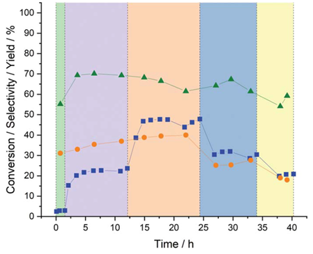 环己酮肟是生产己内酰胺的关键前体,己内酰胺是一种用于合成聚酰胺尼龙-6的日用化学品。随着尼龙-6的全球产量预计到2024年将达到每年890万公吨,预计对环己酮肟的需求将同时增加。生产环己酮肟的传统路线涉及环己酮与硫酸羟胺的反应,产生硫酸铵-一种应用有限的低价值肥料-作为主要副产物。替代路线具有较低的反应pH值(通过复杂和高能量的提取步骤)或对所需产物的选择性较低。使用钛硅酸盐-1 (TS-1)作为催化剂,环己酮、氨和预先形成的H2O2作为反应物,开发了克服这些挑战的单步氨肟化工艺。在该方法中,羟胺由TS-1原位催化形成,该中间物质随后与环己酮非催化反应生成肟。TS-1对H2O2的催化活性在许多选择性氧化过程的发展中至关重要,这通常归因于TiIV位点容易配位多种物质的能力,在环己酮氨肟化的情况下,这种能力在羟胺的形成中至关重要。尽管催化剂设计的广泛进步导致了一系列钛硅酸盐的发展,这些钛硅酸盐对环己酮氨肟化具有高选择性并提供更高的催化稳定性[包括Ti-MOR、Ti-Beta、TS-2和Ti-MWW,TS-1仍然被广泛认为是涉及H2O2的反应的工业标准。虽然基于H2O2/TS-1的工业氨肟化工艺(占全球每年约600万公吨的肟产量)提供了优异的催化选择性,但通常需要过量的H2O2,因为氧化剂在相关反应条件下(高温和高pH)稳定性低,导致工艺成本增加。此外,预先形成的H2O2需要从集中的生产点运输,在那里它的生产浓度大大超过氨肟化过程中所需的浓度;必要的稀释实际上浪费了先前在蒸馏和浓缩步骤中使用的能量。此外,H2O2的不稳定性需要添加酸和卤化物稳定剂以防止其在运输和储存过程中降解,这反过来会限制催化剂的稳定性,通过腐蚀降低反应器寿命,并产生与从产物流中除去它们相关的大量成本。同样,所有使用过氧化氢的化学转化都在一定程度上避免了这些缺点。使用预制过氧化氢(H2O2)的环己酮氨肟化目前在商业上用于生产环己酮肟,环己酮肟是尼龙-6生产中的重要原料。今日,上海交通大学化学化工学院陈立桅教授、刘晰研究员、英国卡迪夫催化中心Graham Hutchings教授合作研究表明,通过使用负载的金-钯(AuPd)合金纳米粒子与钛硅酸盐-1 (TS-1)催化剂结合,可以根据需要原位产生H2O2,产生选择性>95%的环己酮肟,与当前的工业路线相当。还演示了几种附加的简单酮的氨肟化反应。这种方法消除了运输和储存高度集中问题、稳定H2O2的需要,潜在地实现了大量的环境和经济节约。这种方法可以形成目前依赖于预先形成的H2O2和TS-1的组合的许多化学转化的替代路线的基础,同时允许相当大的工艺强化。相关研究工作以“Highly efficient catalytic production of oximes from ketones using in situ–generated H2O2”为题发表在国际顶级期刊《Science》上。祝贺上海交通大学!图1. 提出原位H2O2合成环己酮肟氨肟化的关键反应途径图2. 与TS-1结合使用的负载型0.66%AuPd/TiO2(氯化物-O)催化剂通过原位产生H2O2对环己酮氨肟化的催化活性作者之前已经开发了用于从提供高合成速率和> 99% H2利用率的元素直接合成H2O2的催化剂。然而,到目前为止,直接法还不能与目前H2O2生产的工业路线相媲美,主要是因为避免潜在爆炸危险所必需的稀释H2和O2流限制了H2O2的生产。如果产生H2O2,然后在原位迅速消耗掉,这个缺点就不再存在。事实上,原位生成的H2O2的应用是许多化学原料稳定化的长期目标,对一系列选择性氧化反应进行了研究,包括丙烯环氧化、醇氧化和甲烷部分氧化。然而,早期的工作并没有展示出对当前各种工业方法的可行替代方案,并且通常受到转化率低或对所需产品选择性差的阻碍。事实上,在许多情况下,原位方法经常导致不可预见的复杂情况,例如产生潜在的有害副产物,通常主要由竞争性氢化反应驱动。此外,与催化剂失活相关的问题以及对不利的溶剂系统或昂贵的添加剂的要求阻碍了原位生成的H2O2路由到选择性氧化的采用。这种原位方法在环己酮氨肟化中的应用不仅受到早期研究中概述的潜在缺点的阻碍,还受到反应序列的两个关键过程之间的条件的实质性差距的阻碍。在低pH值和低于环境温度下有利于H2O2的直接形成,而与氨肟化过程相关的高反应温度和碱性条件对H2O2的稳定性都是有害的。作者研究报道,有可能弥补这一条件上的差距,将H2O2的直接合成与环己酮氨肟化结合起来,以与当前商用过程中使用预制化过氧化氢观察到的产率相当。这是通过在AuPd纳米粒子上原位生成H2O2以及商业TS-1催化剂来实现的。图3. TS-1负载复合AuPd催化剂原位生成H2O2催化环己酮氨肟化反应的性能和稳定性图4. 0.33%Au-0.33%Pd/TS-1(醋酸盐-O+R)催化剂连续反应参数的优化环己酮肟的当前工业路线的主要挑战与TS-1催化剂的失活有关,通过在反应物流中存在相对高浓度的氨诱导形成TiO2-SiO2畴。与这些观察结果一致,作者通过XPS进行分析表明,在氨肟化反应中,Ti的物种形成比连续重复使用有微小的变化,这表明形成了类TiO2表面物种,尽管没有观察到催化剂活性的损失。近年来,中空钛硅酸盐(HTS-1)已经通过TS-1的合成后处理得到开发,发现这些材料在用于氨肟化反应时比母体材料提供更大的稳定性。因此,作者认为,在潜在的工业应用中,通过采用HTS-1或替代的钛硅酸盐载体,可以减少任何失活。作者进行了详细的技术经济评估,假设0.33%Au0.33%Pd/TS-1(乙酸酯-O+R)催化剂的寿命与当前工业路线中报告的TS-1相当,并且TS-1