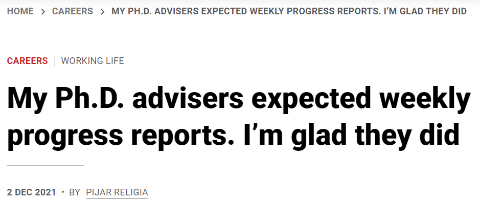 但日本大阪大学访问学者Pijar Religia近日在Science网站发文表示,很庆幸读博期间导师要求每周交工作进展汇报。Religia认为,工作周报帮助其完善思维、提高效率,并且可以从导师那里得到建设性的反馈,这些都成为她获得博士学位之路上的基石。在读博的最初几个月里,我每周都在努力完成一项任务:坐在电脑前为我的导师写一份最新的报告。很多时候,我觉得自己陷入了困境。我不知道该写些什么,因为我觉得我做的工作中值得分享的还不够多。我的压力急剧上升,我开始为了报告而做实验。但在我的项目结束时,我才意识到周报不需要塞满数据和成果。相反,它们可以作为一种工具来完善我的思维,并且我可以从中获得所需的反馈。我从我的祖国印度尼西亚搬到了日本,在那里我习惯了不同的研究和培训文化。攻读硕士学位时,我的研究没有那么结构化,只有当我有问题或遇到难题时,我才去找我的导师。这也带来了一系列问题——比如,在我临近毕业时,我还没有完成我想完成的所有事情。在日本,我竟然每周都要向我的导师汇报科研情况,而且他们没有告诉我汇报什么东西。所以,当我提出我的研究问题和研究设计时,我仅仅简短地汇报了任何我想到的新想法或实验计划。但看到我的实验室伙伴们所报告的进展,我很快感到了压力,我意识到自己需要和他们交流一些更实质性的东西。这促使我更快地投入到实验工作中。我开始每周做实验,通常是在每周发邮件前的两三天疯狂地把它们联系在一起。实验成功了,但我总觉得这是因为幸运,迟早会因为粗心大意被人发现。在一次小组会议上,我的导师训斥了一个实验室成员,因为他在一个设计有问题的实验上浪费了时间、精力和金钱。我知道,我当时的大部分工作也都是如此。显然,我需要改变一下了。我意识到,在我花时间计划项目时,早期的报告可以作为一个框架——一个我可以建立和扩展的框架。在那些邮件中,我并没有过多地提及细节,因为想法和计划在我看来并不是什么重大的成就。但在一次又一次的实验中,我发现制定详细的计划的确是有价值的。如果我再回到实验设计阶段,我不知道导师们会作何反应,但我认为值得一试。接下来的几周我都在看文献,思考项目的大目标。当我第一次写邮件更新时,我很紧张,因为我列出了读过的所有论文和探索过的想法,但缺乏具体的数据。让我感到宽慰的是,导师们没有反对。在一份报告中,我梳理了一些论文,希望可以找出一个实验步骤的正确方法。在报告完成后,我的一位指导老师向另一位具有相关专业知识的教授寻求建议。这帮助我更快地对我的方法做出最终决定。扩展性思维让我更有成效,并且能让我更深入的探索课题。我的研究变得更有效率,我遇到的死胡同也更少了。我还意识到,在每周的更新中写下详细的想法和计划,为自己提供了一个表达这些想法和计划的宝贵机会,这帮助我更自信地接触我的导师,并进行更有成效的讨论。随着时间的推移,我不再把更新周报看作是一种负担,而是把它们看作是一种工具——逐步建立我的研究故事的章节,并在这个过程中从导师那里获得建设性的反馈。在博士实验室工作的最后一天中,我做了一件在最初6个月里从来没有想过的事:我感谢导师们要求每周汇报实验进展的传统。它帮助我收集了一些“小石头”,我最终用它们来建造通向我博士学位的台阶。https://www.science.org/content/article/my-ph-d-advisers-expected-weekly-progress-reports-i-m-glad-they-did