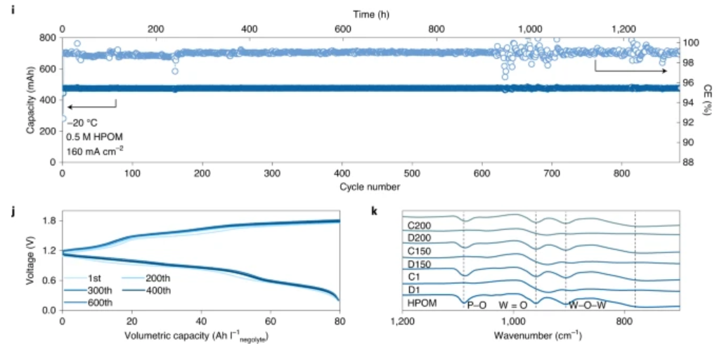 水溶液液流电池在低温下的正常工作常常受到氧化还原活性物种溶解度低、电解液冻结以及反应动力学迟缓等因素的干扰。近日,香港城市大学卢怡君等报道了一种基于多电子的杂多酸(H6P2W18O62,HPWO)负极电解液能使得水溶液液流电池在低温下稳定工作。