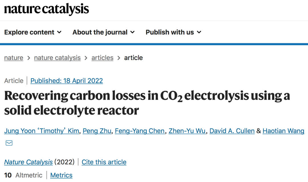 Kim, J.Y.‘., Zhu, P., Chen, FY. et al. Recovering carbon losses in CO2 electrolysis using a solid electrolyte reactor. Nat Catal (2022).