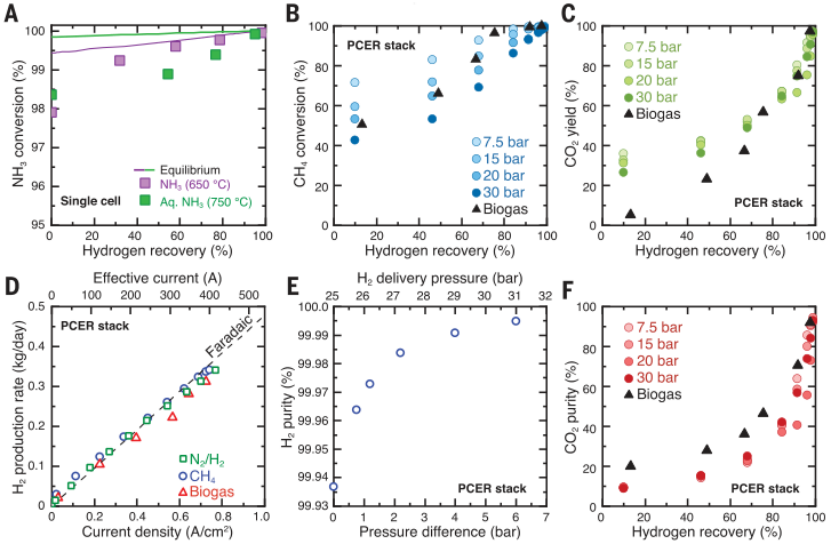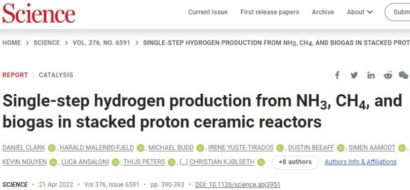 【1】Daniel Clark et. al. Single-step hydrogen production from NH3, CH4, and biogas in stacked proton ceramic reactors. Science, 2022, 376:390-393