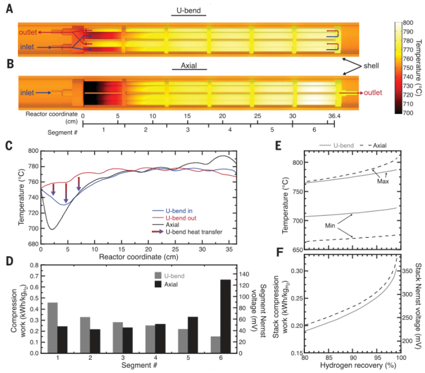 在操作过程中,单个电池将是净吸热或放热的,这取决于反应程度以及整个烟囱长度内的H2分离和压缩(图1D),需要进行内部热交换。作者采用了一个三维多物理模型,该模型集成了SMR+WGS和ADH的耦合气流、传热、电流分布和反应动力学,该模型从单个单元格到堆级别捕获行为。作者设计为U型弯曲气流模式,通过歧管将进入的气体分配到六个气体通道中的三个,同时合并三个相应的排气流。对于轴向型设计,SMR和ADH的快速动力学集中在初始段,而压缩产生的热量主要在后一段。这导致沿反应器长度的温度升高(图1A和3、B和C),进而增加电池能斯特电压和压缩功(图3D)。然而,作者的U形弯管设计通过在空间上平衡压缩产生的热量与反应的热量消耗来缓解这种不匹配,从而实现更均匀的温度分布(图3A)。这反过来会降低电池的能斯特电压,从而降低所需的压缩功(图3F)。