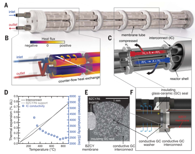 通过使用可逆散热器(例如吸热化学反应)局部平衡这种放热,可以实现更有效的等温操作(图 1C)。然而,将压缩产生的热量的空间分布与整个堆叠反应器中的化学反应程度相匹配,这是将PCER从实验室扩展到商业规模的主要障碍之一。此外,由于缺乏具有高导电性和高达800°C的化学稳定性的互连材料,阻碍了具有有效电流分布的规模化反应器。在热循环过程中,反应堆部件的热膨胀不匹配会导致机械应力和电气接触失效。