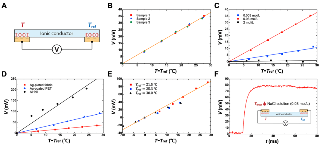 根据离子导体、电子导体和介电层的不同组合方式,温度传感器可设计成多种构型。当离子导体与电子导体不发生化学反应时,不需要引入介电层。首先,他们使用一种包含两个离电子结的传感构型,以含氯化钠水凝胶为离子导体,纳米银导电织物为传感端电子导体,金片为参考端电子导体,对温度传感的基本原理与特性进行了系统的研究(图2)。研究发现传感器灵敏度与离子浓度和传感端电子导体种类高度相关,其响应时间大约为10毫秒。