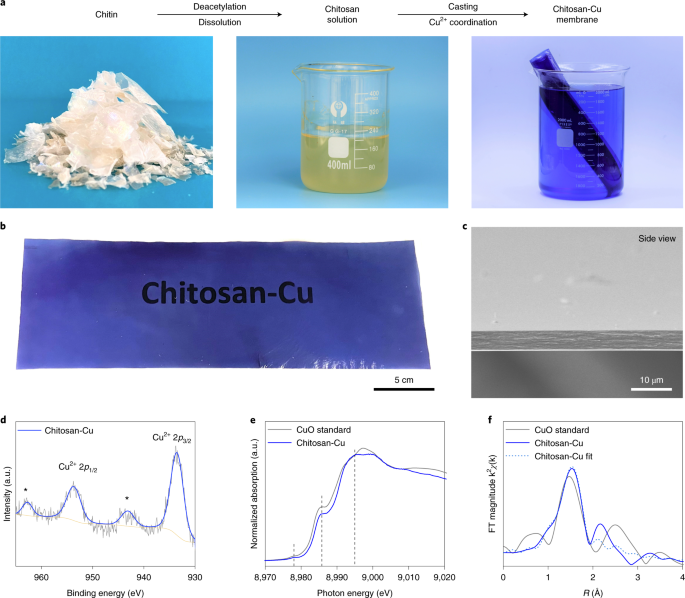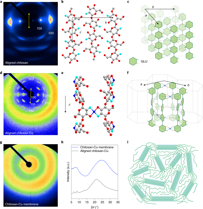 离子交换膜因具有正或负官能团,可促进反离子的选择性传输,而被广泛应用于燃料电池、液流电池、电解槽等领域。作为应用最广泛的质子交换膜,Nafion具有质子传导率高、稳定性好、加工性好等特点。然而,质子交换膜中带负电荷的磺酸基团将其功能限制在酸性环境中。相比之下,阴离子交换膜,特别是氢氧化物交换膜(HEM)在碱性条件下运行,故可以使用非贵金属催化剂、双极板和其他堆组件,从而大大降低成本。出于这个原因,越来越多的研究将HEM作为质子交换膜的替代品,开发了几种基于具有阳离子官能团的聚合物的候选材料,例如铵、咪唑鎓和吡啶鎓,用于氢氧化物传导。然而,尽管在苛刻的基本操作条件下,这些阳离子基团仍然容易受到氢氧化物的侵蚀,从而导致HEM材料的降解和长期化学稳定性差。因此,在氢氧化物交换所需的苛刻碱性条件下,开发具有高氢氧化物电导率和足够化学稳定性的HEM仍然是一个持续的挑战。与合成聚合物相比,天然聚合物由于其来源丰富、可持续性更高而受到更多研究人员的青睐,他们越来越多地利用天然聚合物来满足能源需求的潜在解决方案。将天然丰富的几丁质转化为壳聚糖会产生唯一含有游离氨基的多糖,其在阳离子带电状态下可以吸引阴离子(例如OH-)用于阴离子交换应用(图1a)。然而,壳聚糖显示出由具有强氢键的葡萄糖胺单元(GLU)的线性和反平行堆积链组成的正交晶体结构(图1a)。壳聚糖的这种晶体结构限制了离子传输。此外,壳聚糖在水溶液中的显着溶胀和低机械强度进一步阻碍了其作为离子交换膜的实际应用。鉴于此,马里兰大学胡良兵团队提出了一种Cu2+交联壳聚糖(壳聚糖-Cu)材料作为一种稳定且高性能的HEM。Cu2+与壳聚糖的氨基和羟基配位,使壳聚糖链交联,形成六边形纳米通道(直径约1 nm),可以适应水的扩散并促进离子的快速传输,在室温下具有67 mS cm-1的高氢氧化物电导率。Cu2+配位还增强了膜的机械强度,降低了其渗透性,最重要的是,提高了其在碱性溶液中的稳定性(在80 °C下1000 h后电导率损失仅为5%)。这些优势使壳聚糖-Cu成为出色的HEM,研究人员在直接甲醇燃料电池中进一步证明了这一点,该电池具有305 mW cm-2的高功率密度。壳聚糖-Cu HEM的设计原理是通过极性官能团的金属交联在聚合物中产生离子传输通道,这可以激发用于离子传输、离子筛分、离子过滤等多种离子交换膜的合成。相关研究成果以题为“A high-performance hydroxide exchange membrane enabled by Cu2+-crosslinked chitosan”发表在最新一期《Nature Nanotechnology》上。研究人员通过将壳聚糖膜在浓碱性环境下与Cu2+络合的策略,构筑了Cu2+络合的壳聚糖膜。这种膜制备方法简单、无需使用复杂昂贵的试剂且易于实现大面积的制备(图1)。扫描电子显微镜(SEM)和能量色散X射线光谱(EDX)元素映射表明壳聚糖-Cu中的Cu含量为5.6wt%。X射线光电子能谱(XPS)和X射线吸收光谱(XAS)分析了壳聚糖-Cu膜中的Cu价和键合:Cu2+离子与壳聚糖链的氨基和羟基配位,形成壳聚糖-Cu复合物(图2)。进一步,结合XRD表征证明了Cu2+络合过程使壳聚糖由正交晶体(空间群为P212121)转变为三方晶体(空间群为P3221),形成了独特的1nm孔道(图3)。这种晶体结构在干燥润湿之后仍可以保持。图 2. 壳聚糖-铜膜的制备和表征