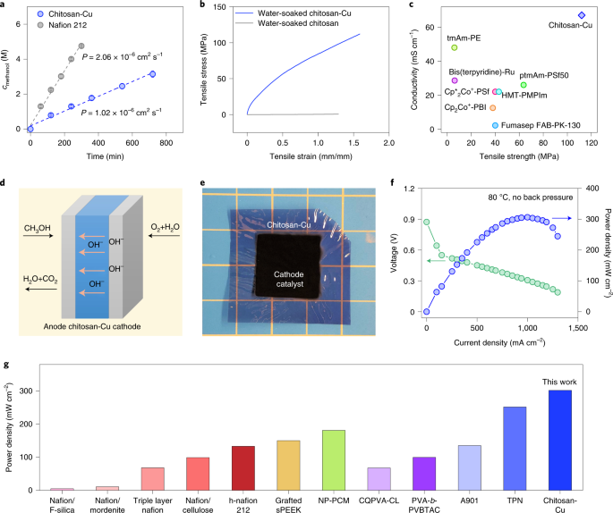 研究表明壳聚糖-Cu材料,它具有丰富的氨基和独特的Cu2+-交联结构,是一种具有高OH-电导率的优异HEM。壳聚糖-Cu膜在100%相对湿度和室温下显示出67 mS cm-1的高OH-电导率,高于相同条件下用NaOH处理的纯壳聚糖(1.7 mS cm-1)。壳聚糖-Cu膜的OH-电导率和吸水率随着相对湿度的增加而增加,表明水对离子传输有重要贡献。此外,壳聚糖-Cu HEM在恶劣的碱性条件下表现出极好的稳定性:壳聚糖-Cu膜在80°C强碱性溶液中处理1000小时后没有显示任何明显的形态和晶体结构变化。分子模拟表明壳聚糖-Cu膜中独特的Cu-N配位由于Cu-N的结合能比Cu-O更强,提供了更高的结构稳定性。研究人员发现Cu2+络合的壳聚糖膜具有低甲醇渗透性和高机械强度。Cu2+络合的壳聚糖膜在直接甲醇燃料电池测试中实现了305 mW cm-2的功率密度。这一性能明显优于其他文献报道的性能。这些优点都有利于其在燃料电池中的应用。