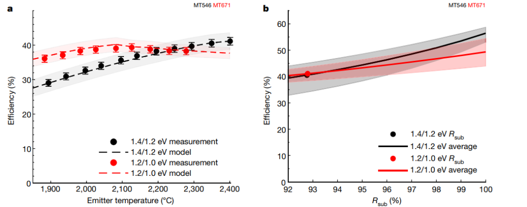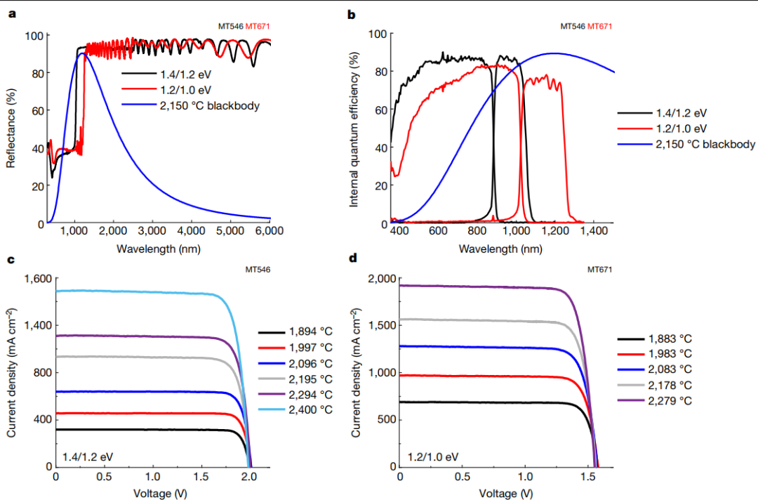 这些单元利用带边光谱过滤的概念来获得高效率,使用高反射背表面反射器将不可用的子带隙辐射拒绝回发射器。1.4/1.2 eV 器件在 2.39 W cm–2 的功率密度和 2,400 °C 的发射极温度下达到 (41.1 ± 1)% 的最大效率。1.2/1.0 eV 器件在 1.8 W cm–2 的功率密度和 2,127 °C 的发射极温度下达到 (39.3 ± 1)% 的最大效率。