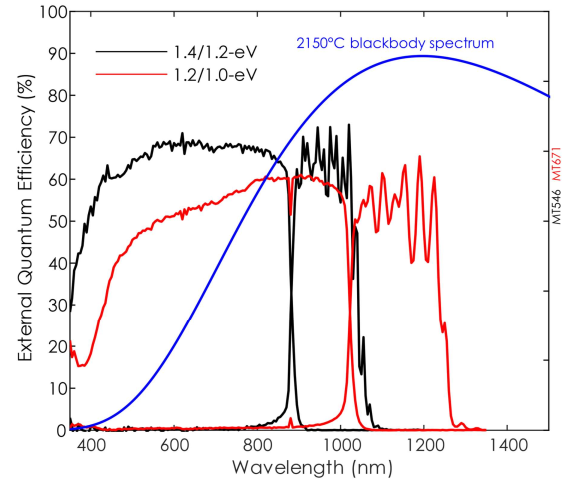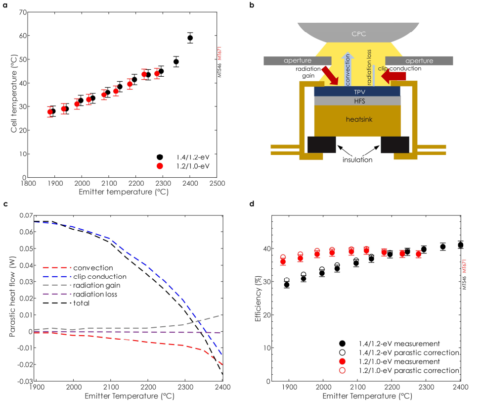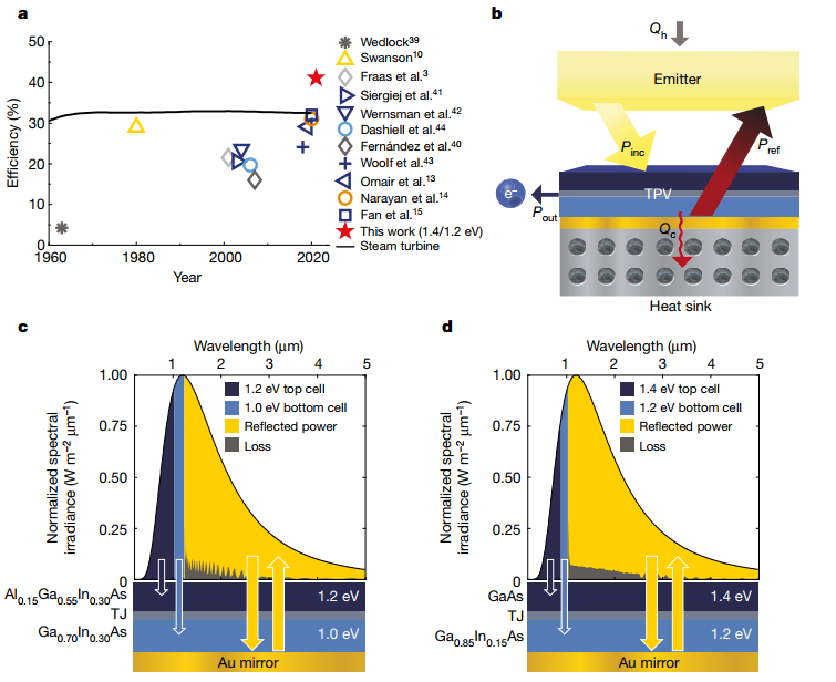 麻省理工学院Asegun Henry等人报道了效率超过 40% 的 TPV 电池的制造和测量,并通过实验证明了高带隙串联 TPV 电池的效率。TPV 电池是双结器件,包含带隙在 1.0 到 1.4 eV 之间的 III-V 材料,针对 1,900-2,400°C 的发射极温度进行了优化。