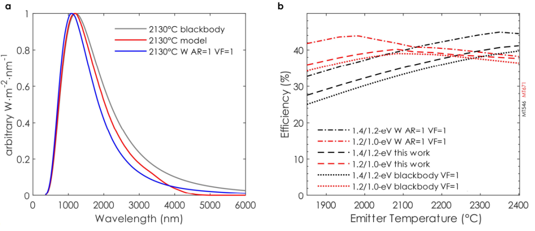 热光伏 (TPV) 主要通过光伏效应将红外波长的光转换为电能,并且可以实现能量存储 和转换的方法,这些方法使用比涡轮机更高温度的热源在当今的电力生产中无处不在。自从在 2,000°C下使用集成背面反射器和钨发射器首次展示 29% 高效 TPV以来,TPV 的制造和性能得到了改进。然而,尽管预测 TPV 效率可超过50%,但在温度低于1,300 °C时器件效率仍仅为32%。